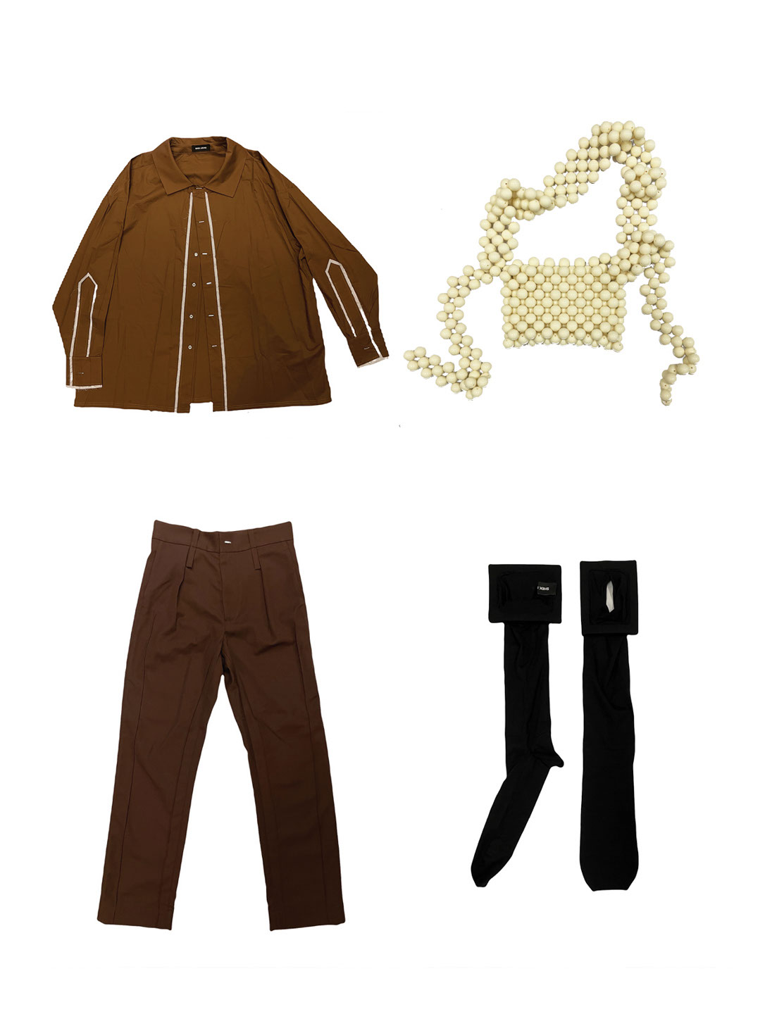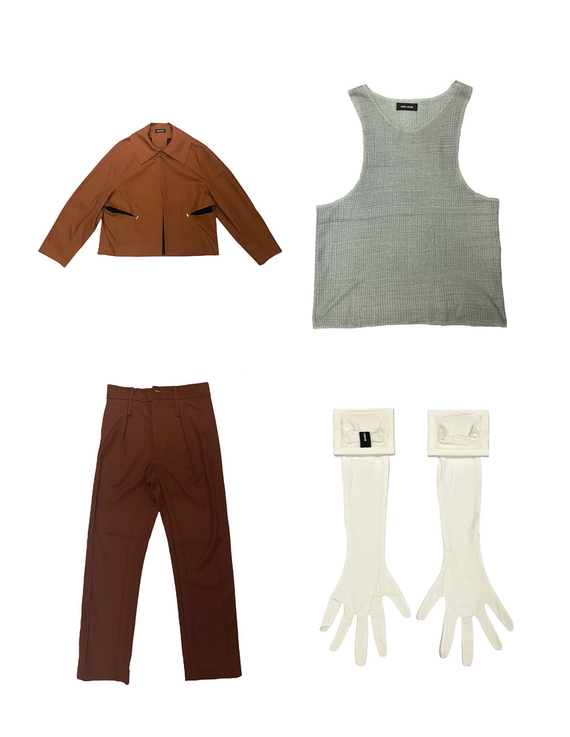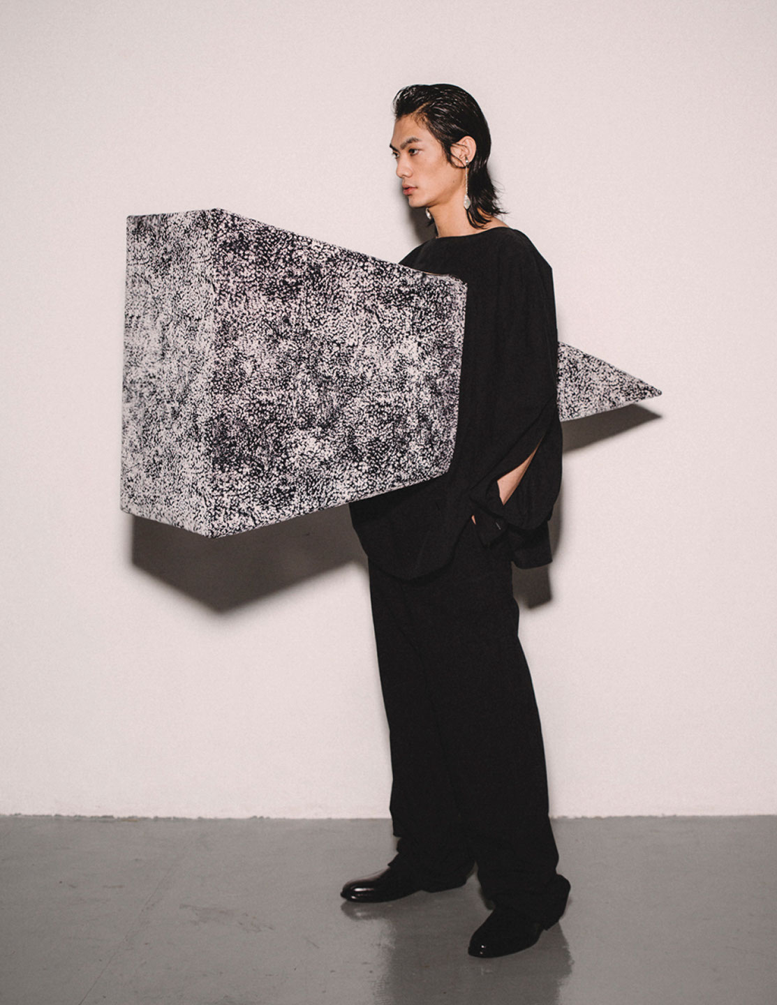 Twisted frames woven into fashion pieces namely gloves, socks and scarfs mirror the newly adapted outcomes, where joy is unexpectedly experienced. Leung’s Trapezium Framed Coat lightly outline the wearer’s body with pin tucks, not only conjuring a crisply enhanced silhouette, but also introduces a twist to one’s wardrobe. Additionally, collaborations with Polish designer, Body Holes for its millinery and Antwerp-based Studio 777 for its fine bristle jewellery, completes the scenic art of the film which the muse finds himself starred in.
