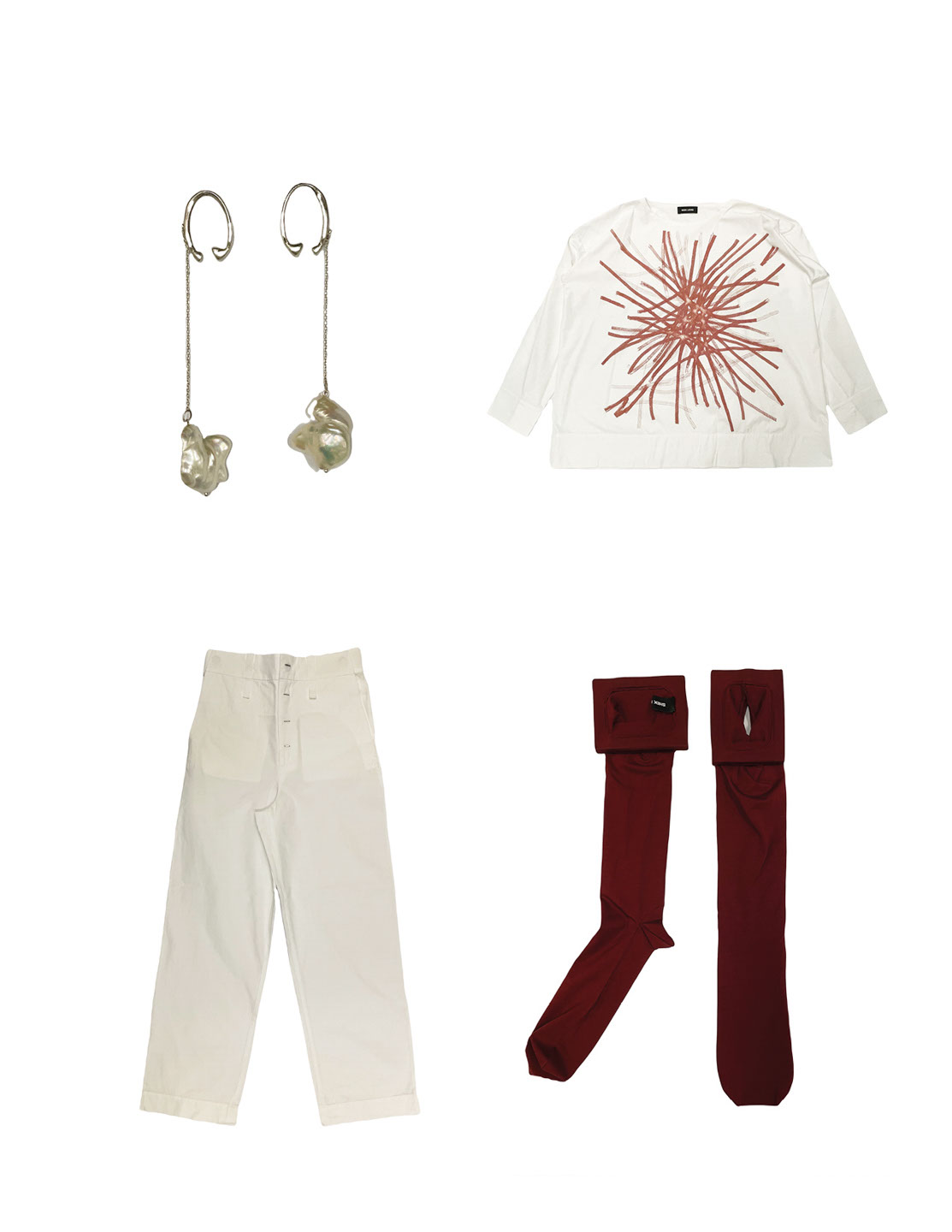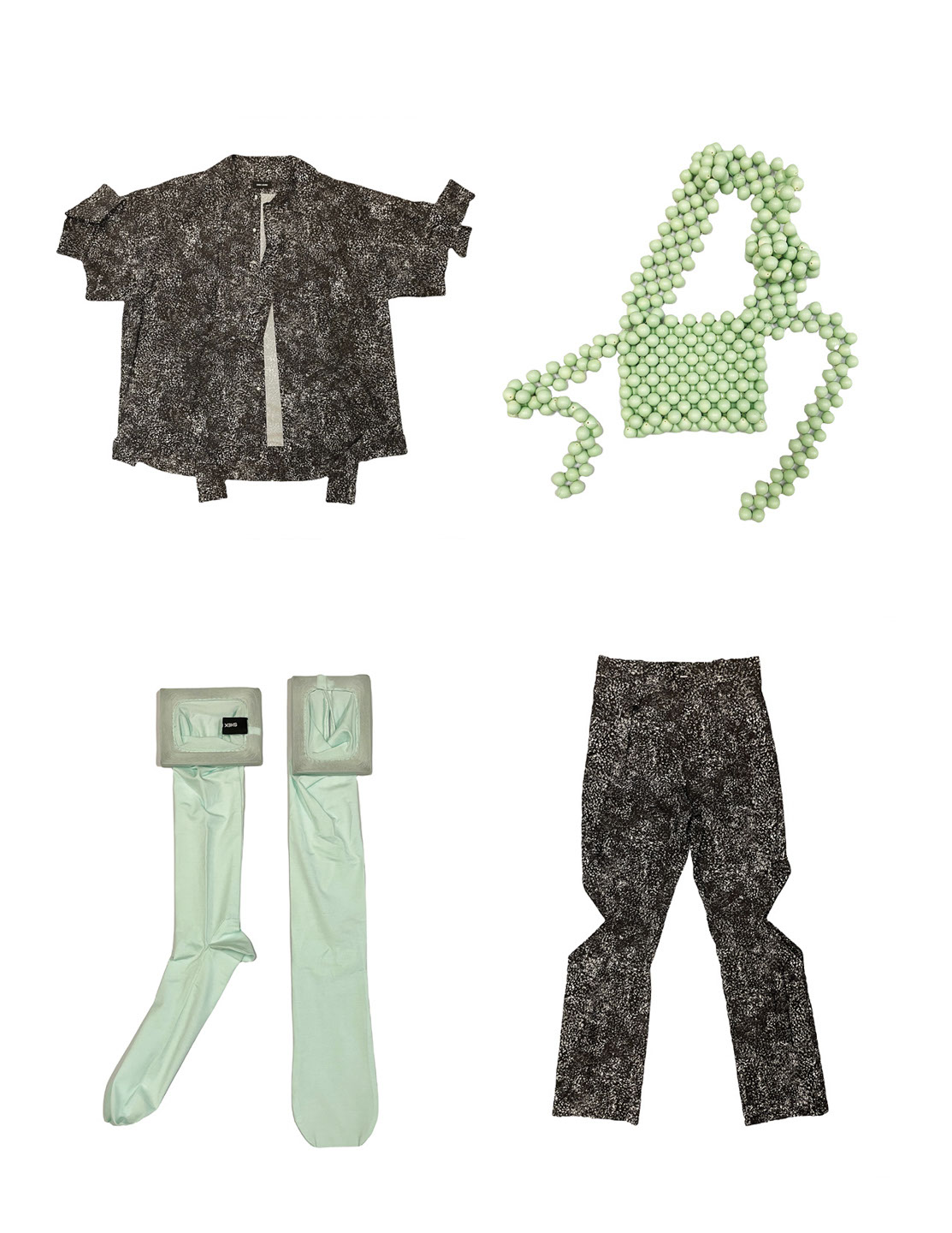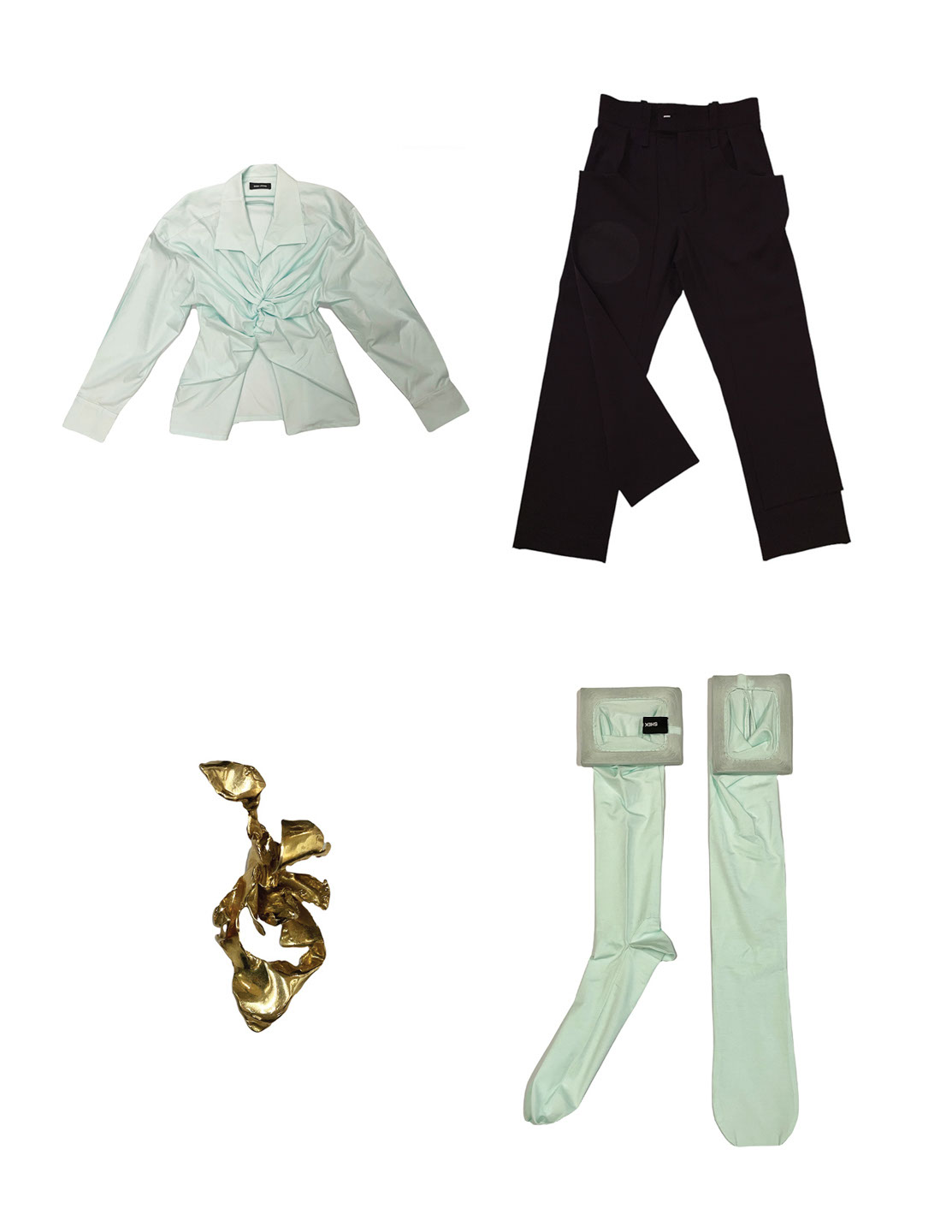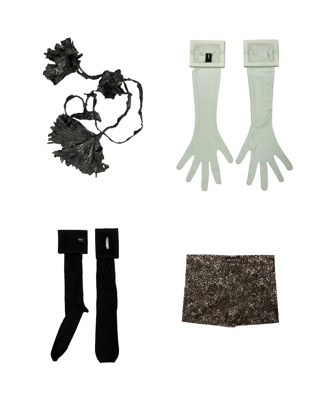 Twisted frames woven into fashion pieces namely gloves, socks and scarfs mirror the newly adapted outcomes, where joy is unexpectedly experienced. Leung’s Trapezium Framed Coat lightly outline the wearer’s body with pin tucks, not only conjuring a crisply enhanced silhouette, but also introduces a twist to one’s wardrobe. Additionally, collaborations with Polish designer, Body Holes for its millinery and Antwerp-based Studio 777 for its fine bristle jewellery, completes the scenic art of the film which the muse finds himself starred in.