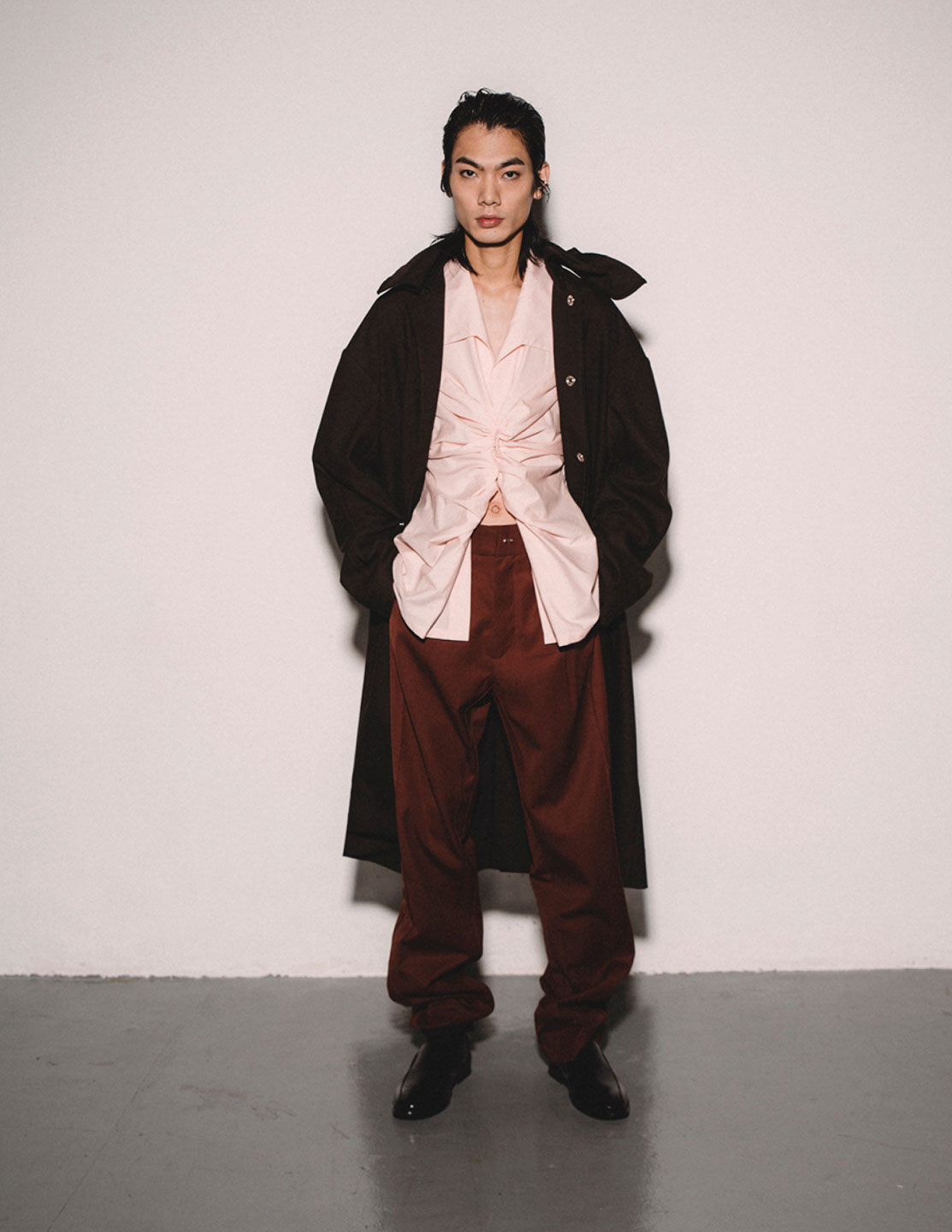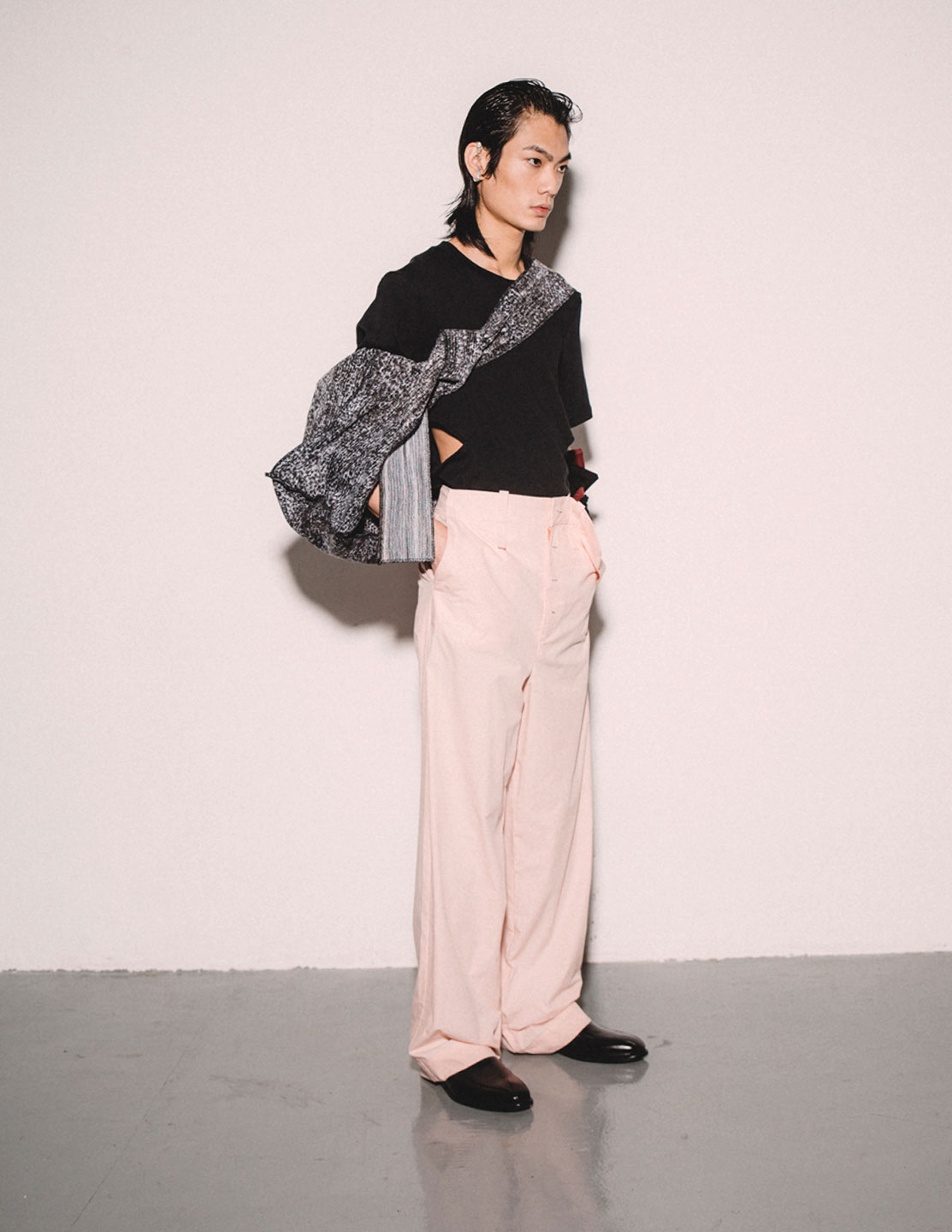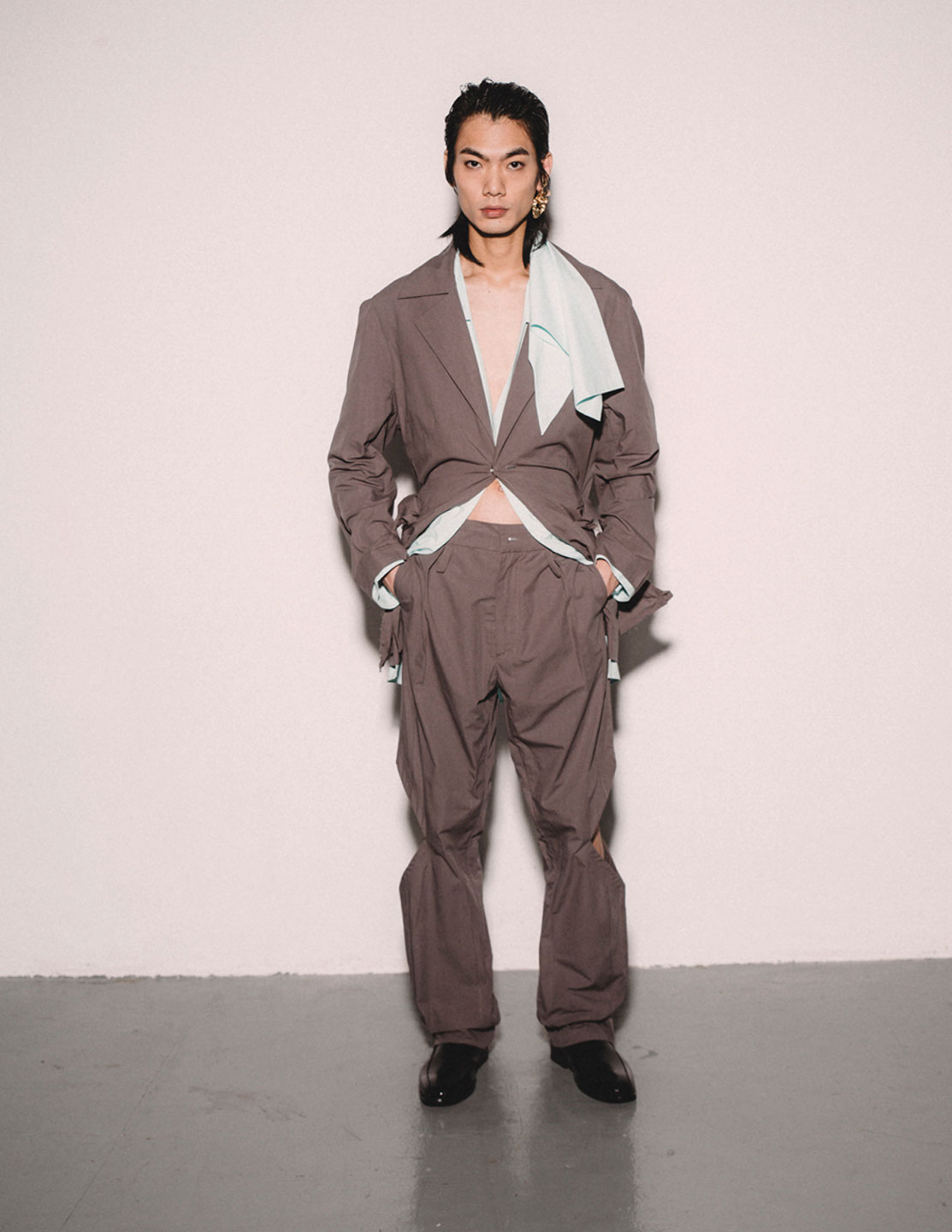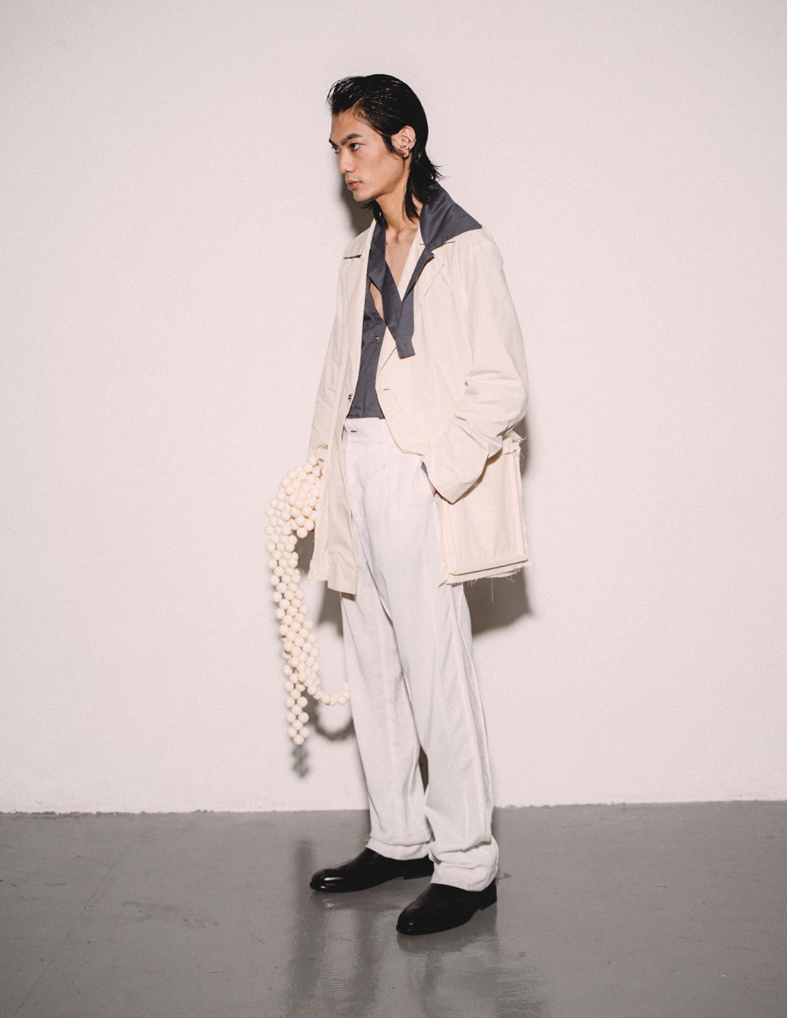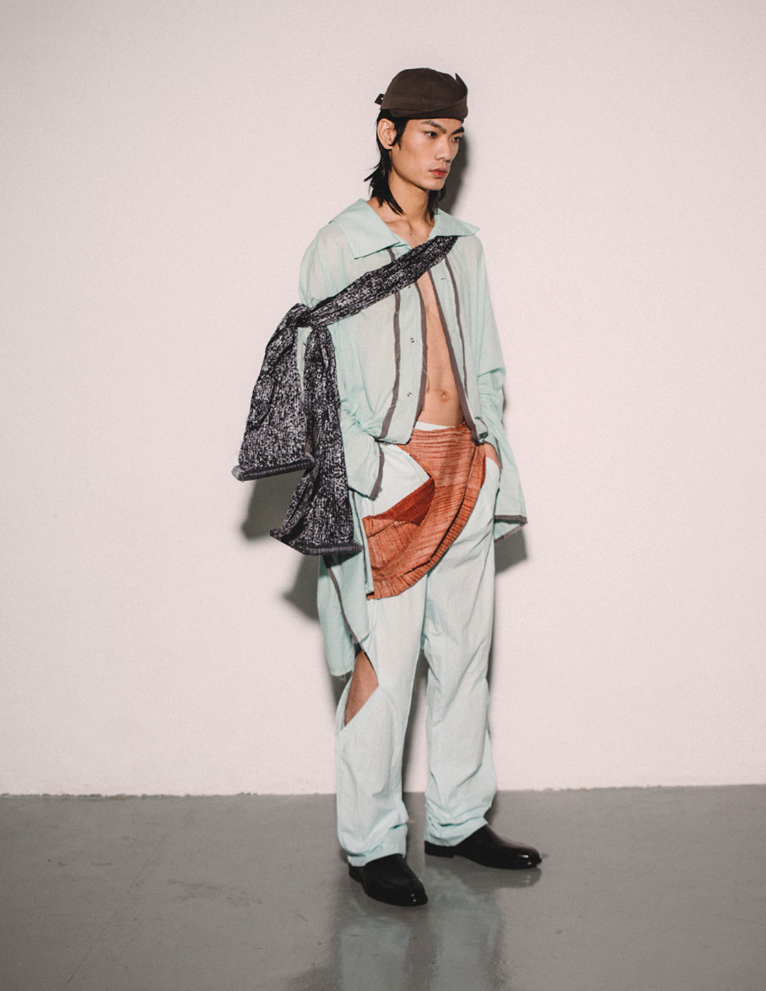Troubled by the particle-filled squalls, the lonely man who forms the muse appears to be unafraid to admit his difficulty to relax, and is stiffened like Leung’s new line of garments, calling for attention with its showpieces. Through translucent cotton voile, a film-like façade is depicted both vulnerably and sensually, starkly contrasting with the conventional tendency to conceal shameful states. Dressing up acts as a form of play, demonstrating sensitive states need not be veiled at all times, and can even be flaunted in slits. When courage is mustered up, and volume of emotions re-attuned, final tears are shed. No longer drenched, the wearer can arise to face chaotic sensations. Amidst distress, occasional progress is anticipated when one marches on.