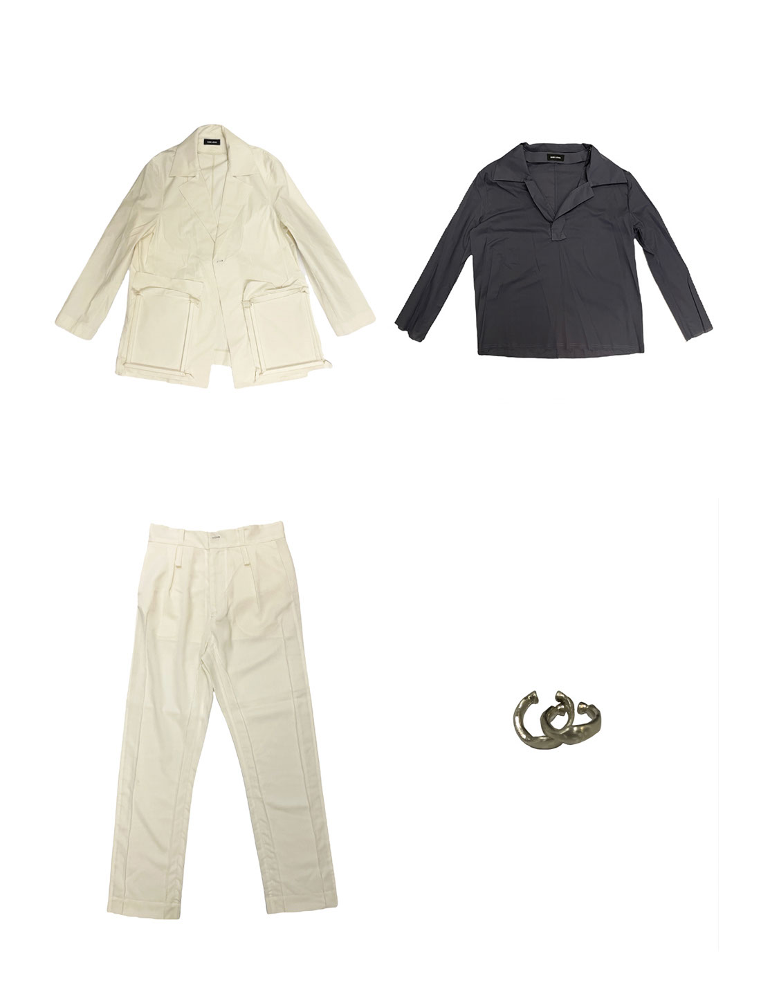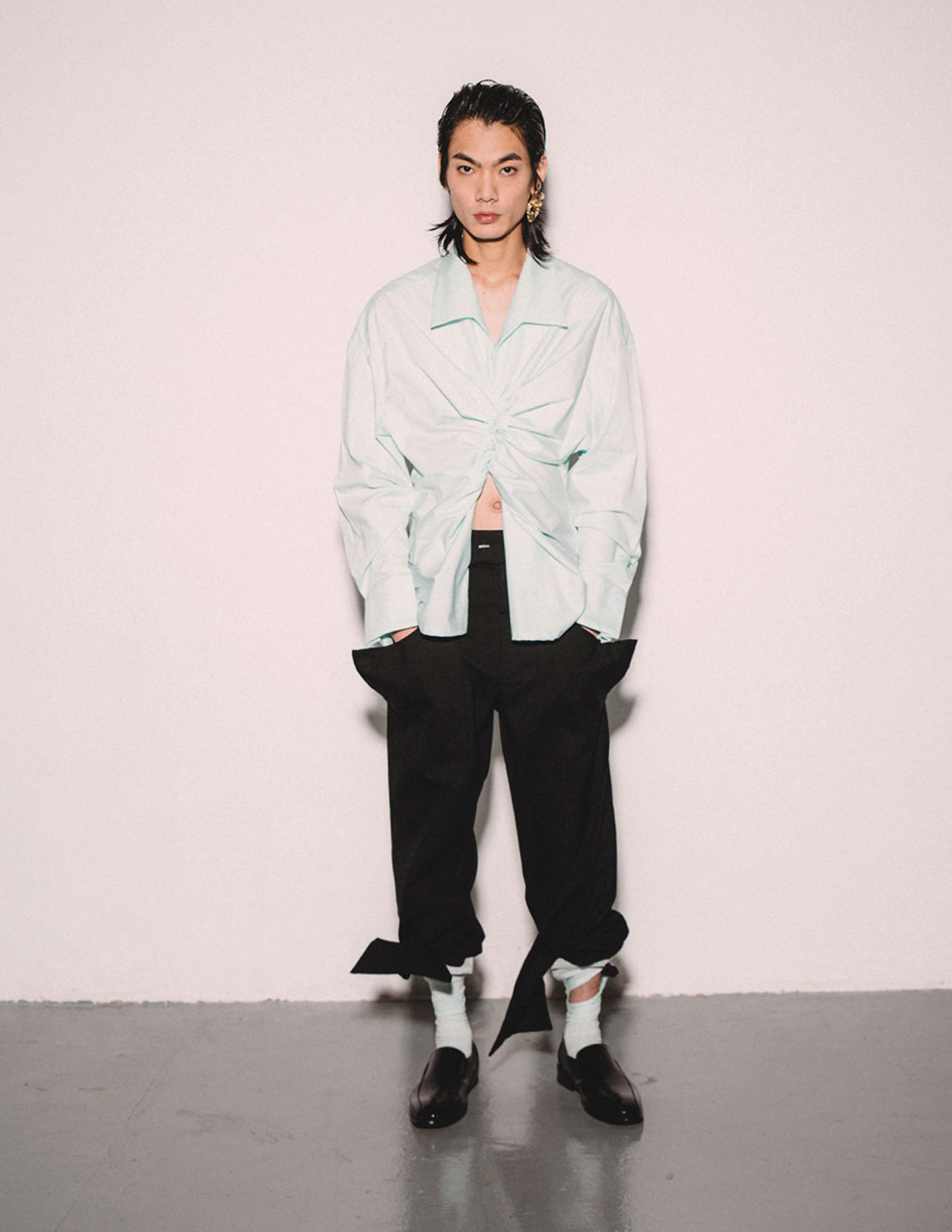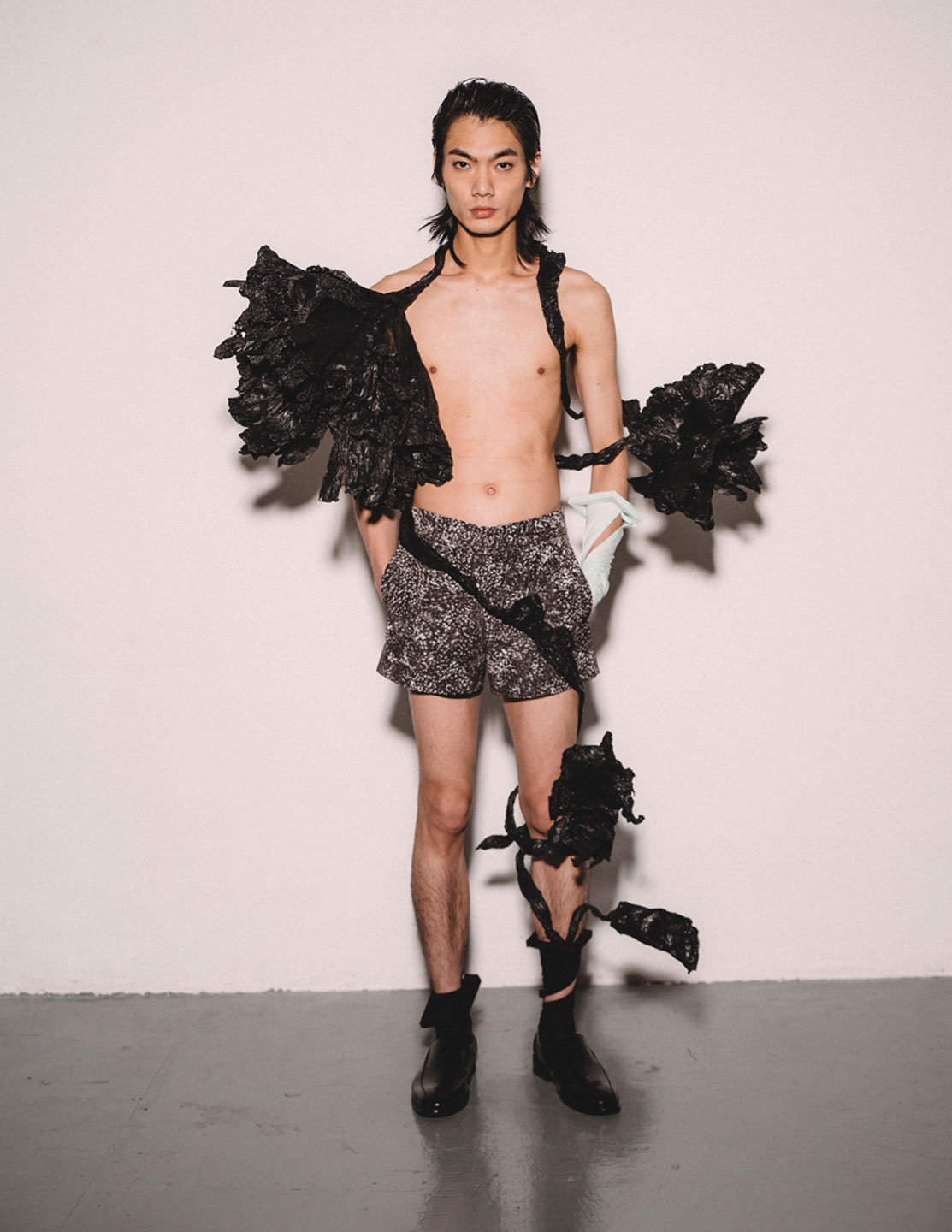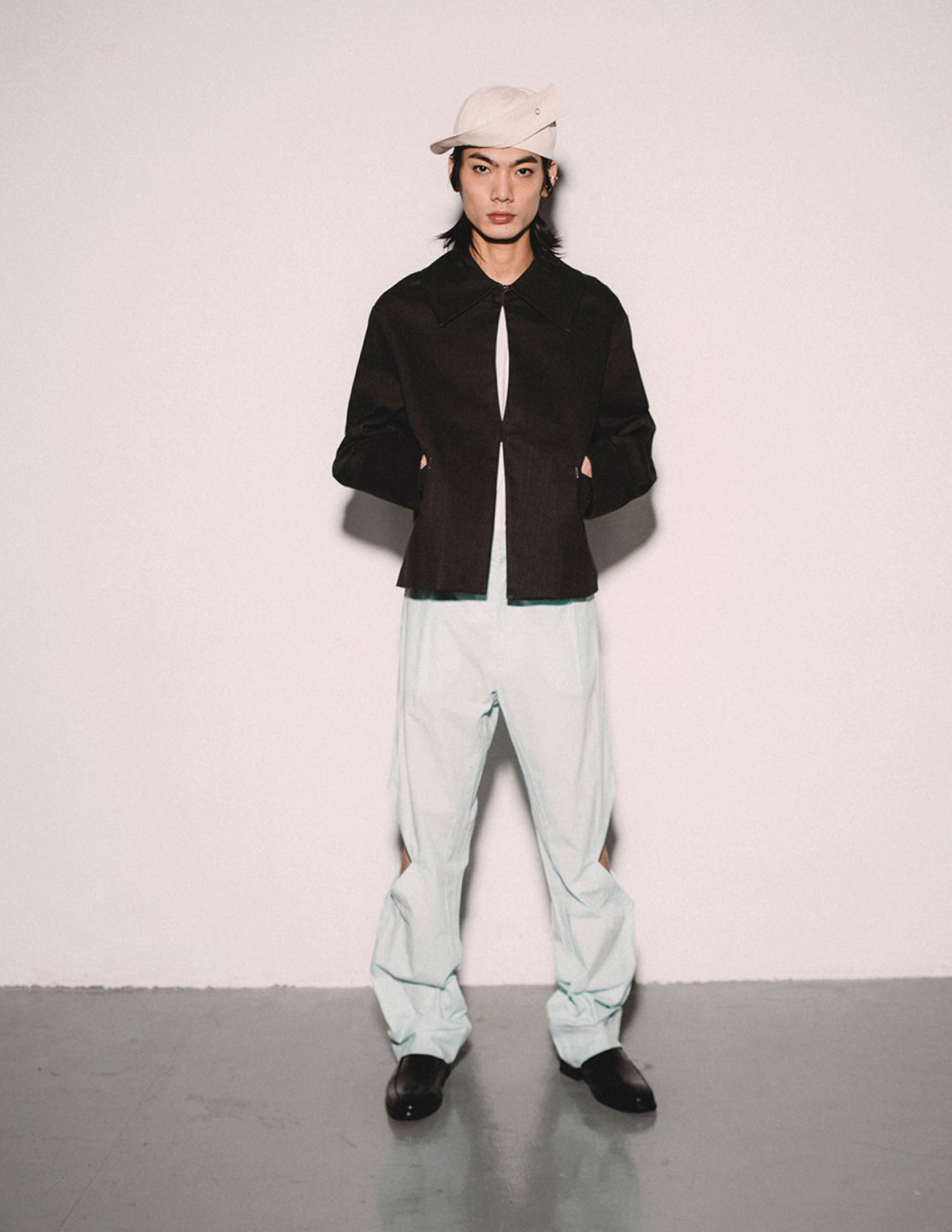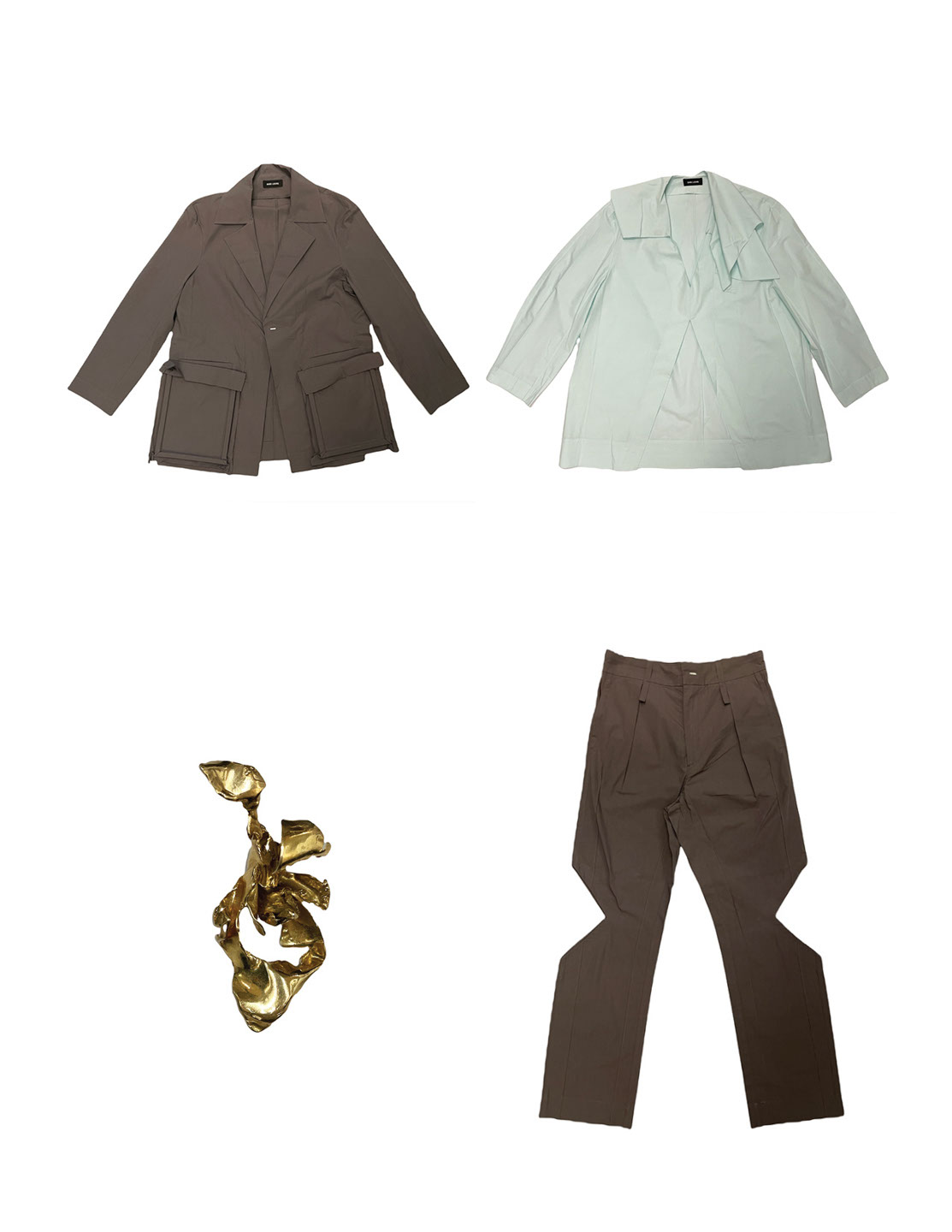 Troubled by the particle-filled squalls, the lonely man who forms the muse appears to be unafraid to admit his difficulty to relax, and is stiffened like Leung’s new line of garments, calling for attention with its showpieces. Through translucent cotton voile, a film-like façade is depicted both vulnerably and sensually, starkly contrasting with the conventional tendency to conceal shameful states. Dressing up acts as a form of play, demonstrating sensitive states need not be veiled at all times, and can even be flaunted in slits. When courage is mustered up, and volume of emotions re-attuned, final tears are shed. No longer drenched, the wearer can arise to face chaotic sensations. Amidst distress, occasional progress is anticipated when one marches on.