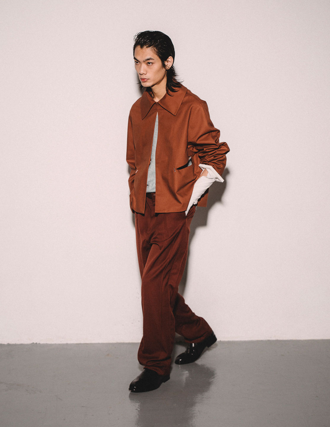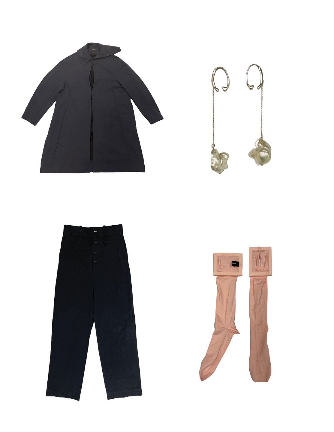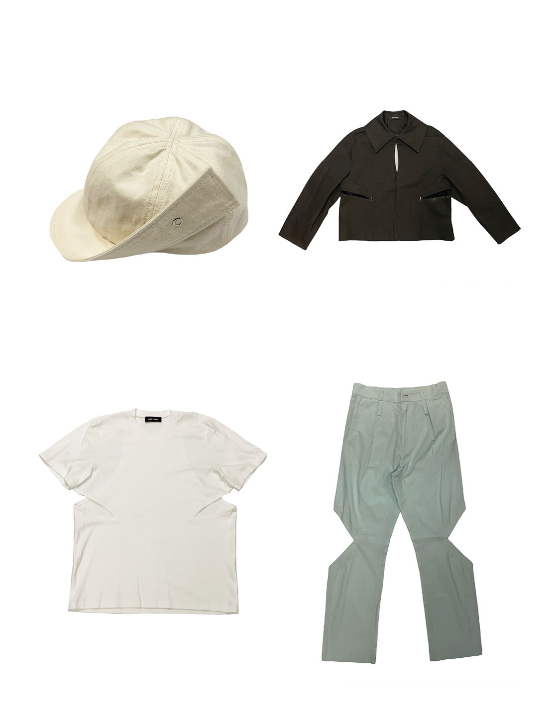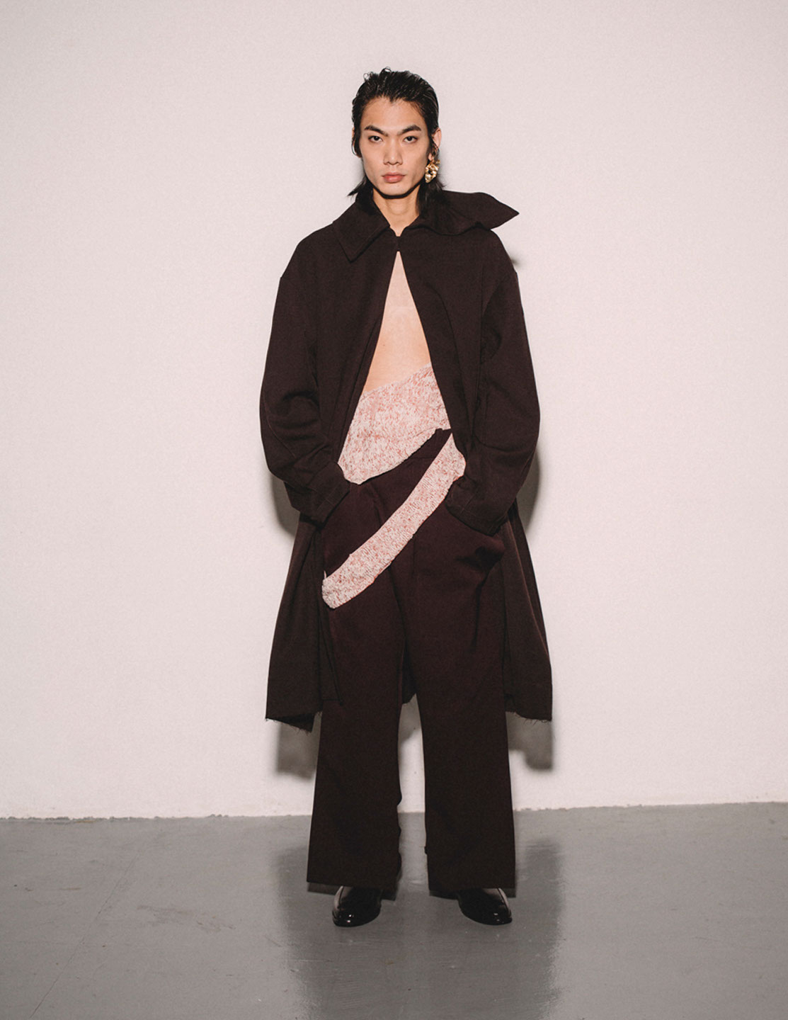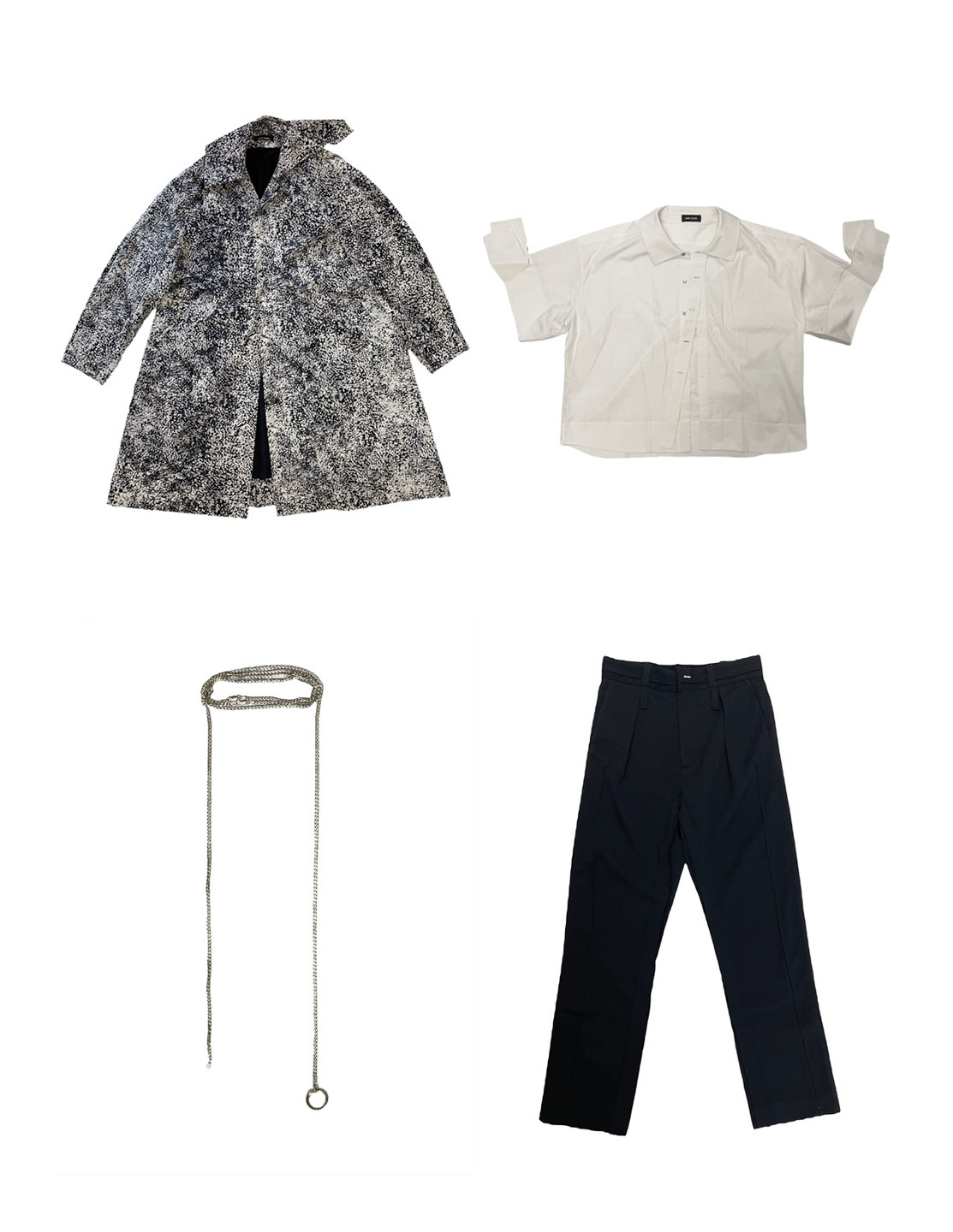 Troubled by the particle-filled squalls, the lonely man who forms the muse appears to be unafraid to admit his difficulty to relax, and is stiffened like Leung’s new line of garments, calling for attention with its showpieces. Through translucent cotton voile, a film-like façade is depicted both vulnerably and sensually, starkly contrasting with the conventional tendency to conceal shameful states. Dressing up acts as a form of play, demonstrating sensitive states need not be veiled at all times, and can even be flaunted in slits. When courage is mustered up, and volume of emotions re-attuned, final tears are shed. No longer drenched, the wearer can arise to face chaotic sensations. Amidst distress, occasional progress is anticipated when one marches on.