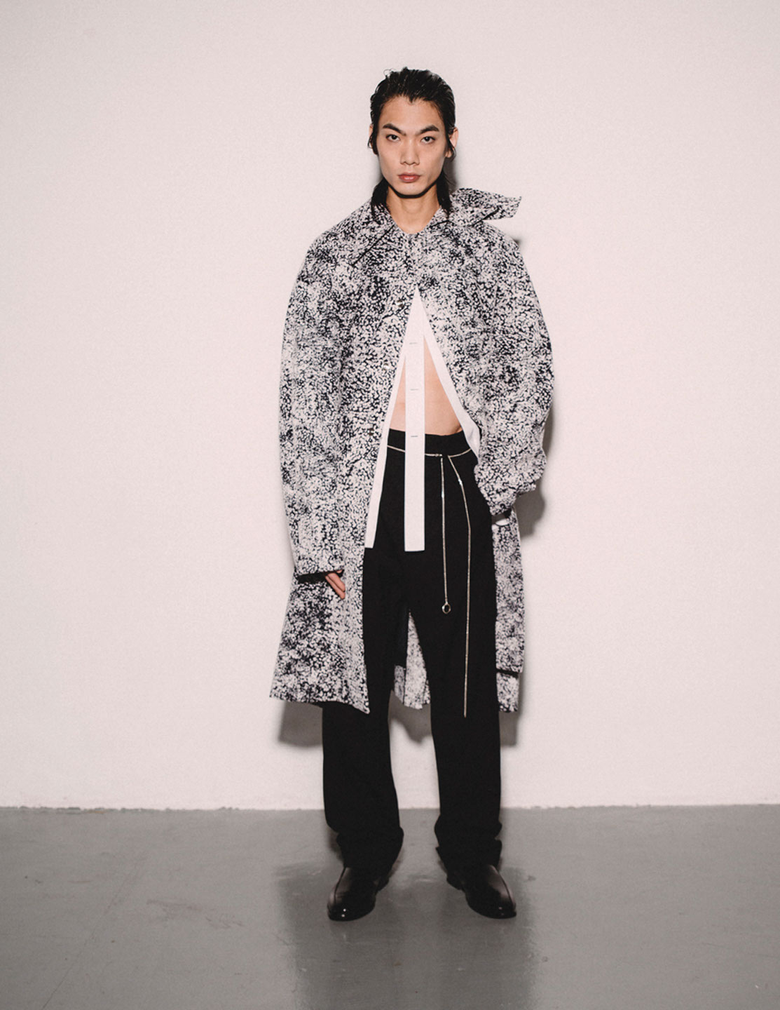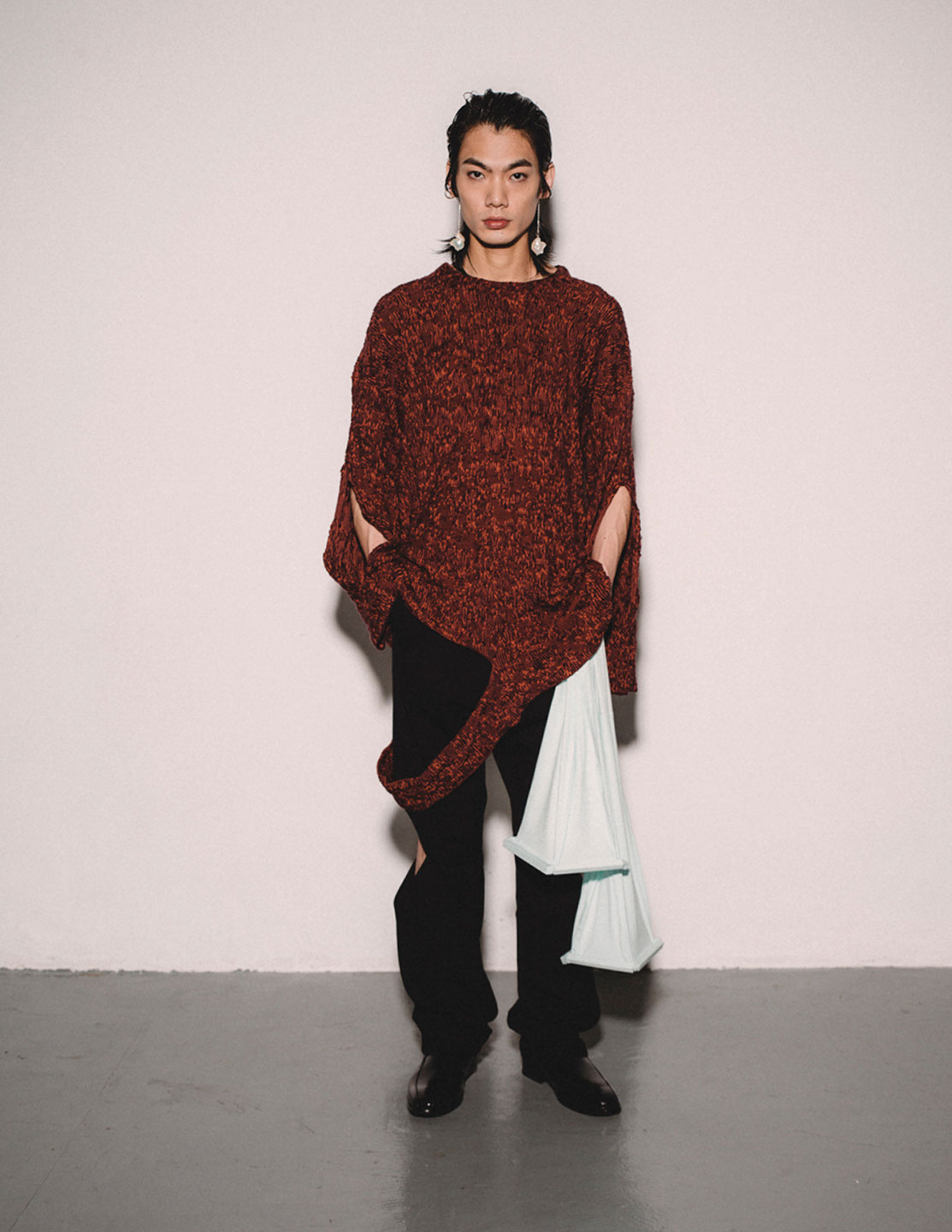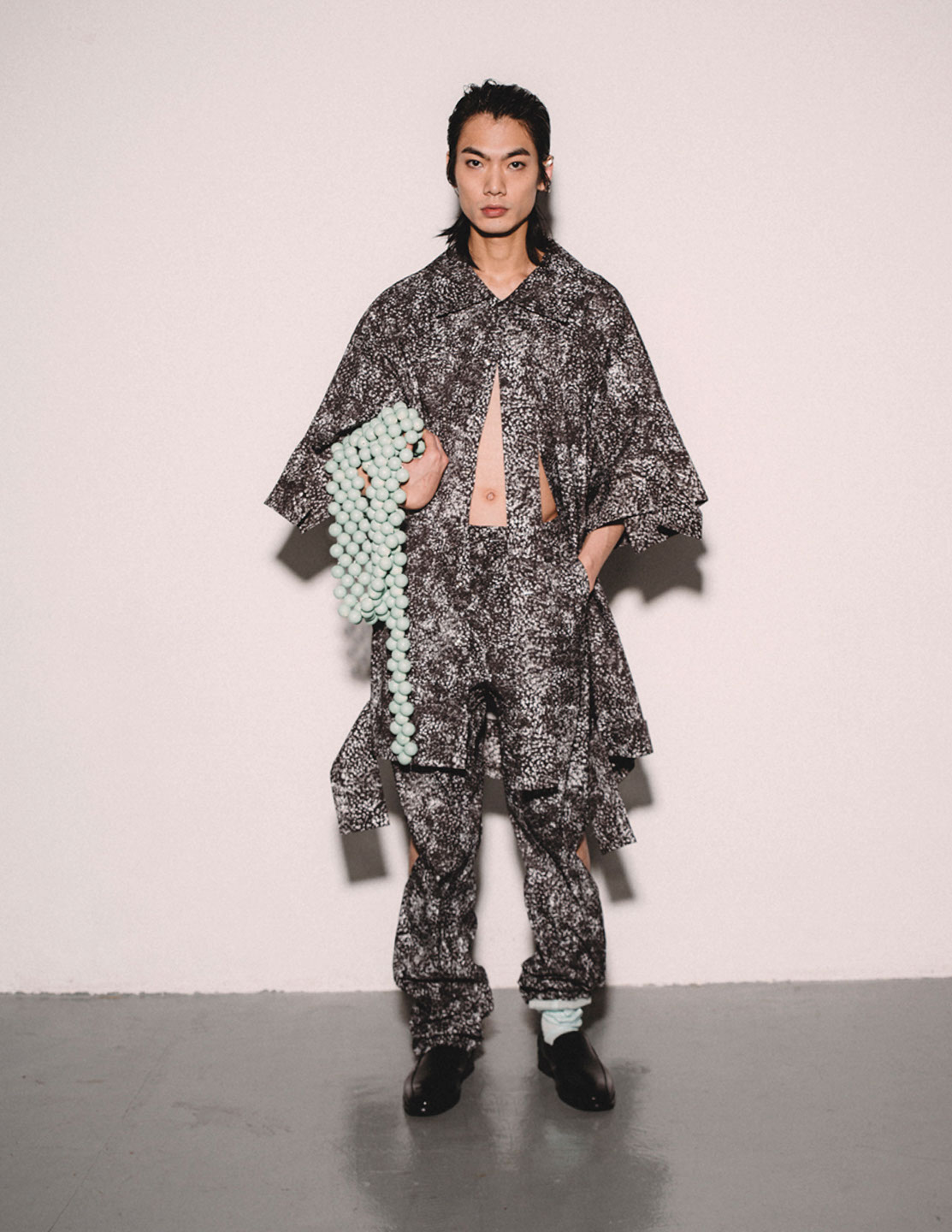Leung draws from his strengths as he deploys his self-made fabrics with cover-stitch mastery (which are traditionally used for garment finishings) and advancing his hand-drawn multimedia grains (digital printing and puff-binding) on knitwear, illustrating layers of ambiguity in unstable times. Meanwhile, he remains open to introducing an occasional tinge of colour as well as fashionable ornaments. The orchid is a species that was featured as a silverware accessory and one of the showpieces due to its notorious hard-to-care-for nature, mirroring the universal humanistic need to be loved.