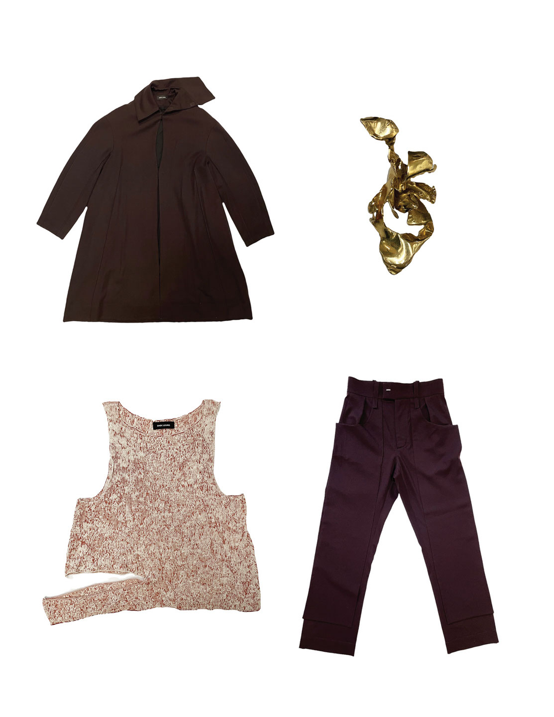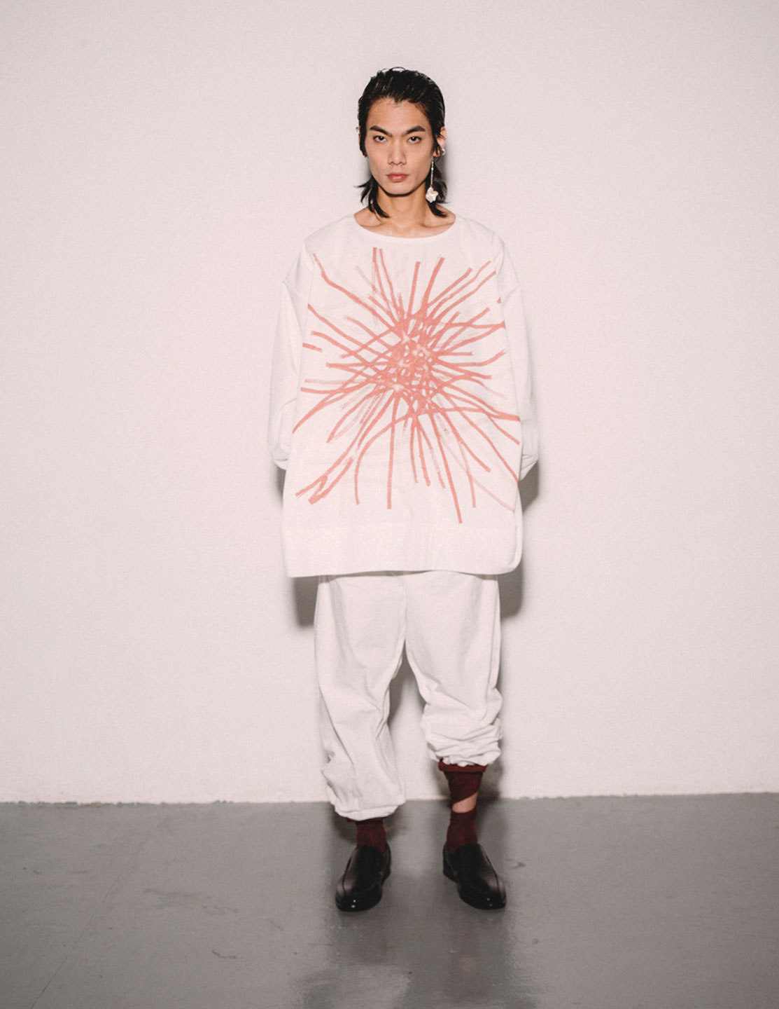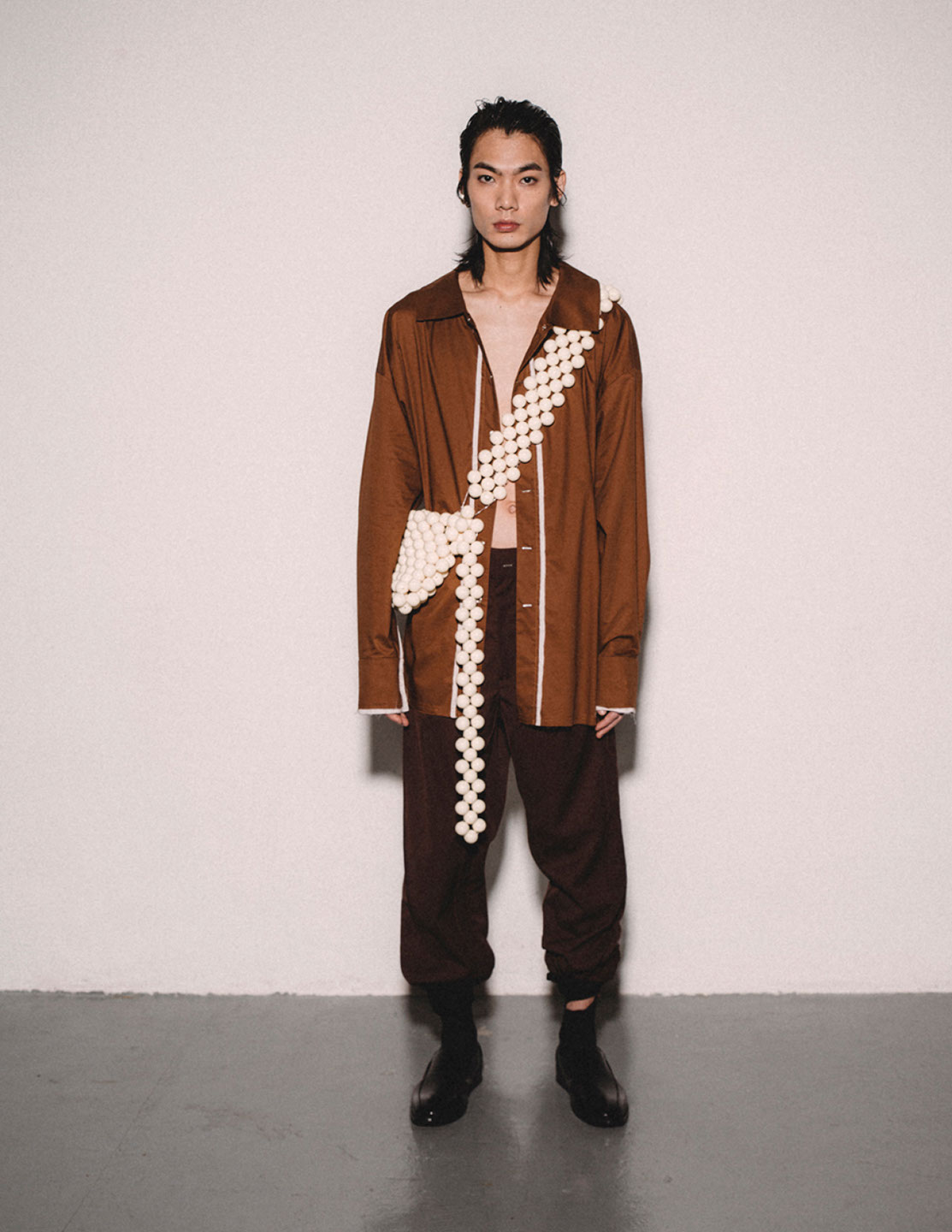 Leung draws from his strengths as he deploys his self-made fabrics with cover-stitch mastery (which are traditionally used for garment finishings) and advancing his hand-drawn multimedia grains (digital printing and puff-binding) on knitwear, illustrating layers of ambiguity in unstable times. Meanwhile, he remains open to introducing an occasional tinge of colour as well as fashionable ornaments. The orchid is a species that was featured as a silverware accessory and one of the showpieces due to its notorious hard-to-care-for nature, mirroring the universal humanistic need to be loved.